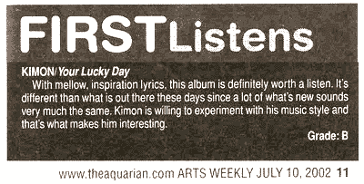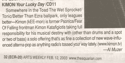 "Twice A Day In Japan is a powerpop disc crammed with strong singable melodies, catchy guitar hooks with lyrics to match, and attitude reminiscent of Butch Walker. This is an effective and inoffensive record that won't push any of your buttons, but doesn't back off the party music value. If you're looking for edgy, go elsewhere. If you're looking for PG-13 hoots and hollers, Kimon's your boy."