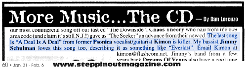 ...whatever the topic, you can be sure that it's handled in a wry, satiric manner without getting more preachy than is strictly necessary. So, when you're picking out music to bring to the next WTO protest, consider leaving the Rage Against the Machine at home and bringing Kimon instead.