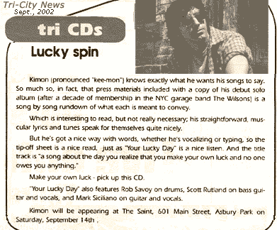 One notable exception is a singer-songwriter out of New Jersey named Kimon (pronounced "kee-mon"). He takes a bitingly forthright analysis of all that's wrong in the world today, wraps it up in lyrics chock-full of nicely turned phrases and clever rhymes, and sets it to bluesy rock 'n' roll, and what do we get? Dissent you can tap your toes to...